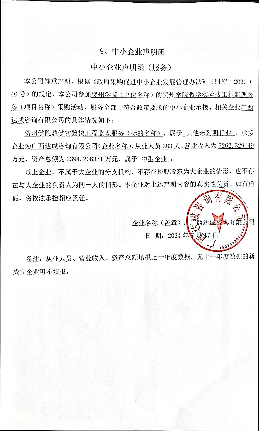 1、广西达成咨询有限公司《中小企业声明函》