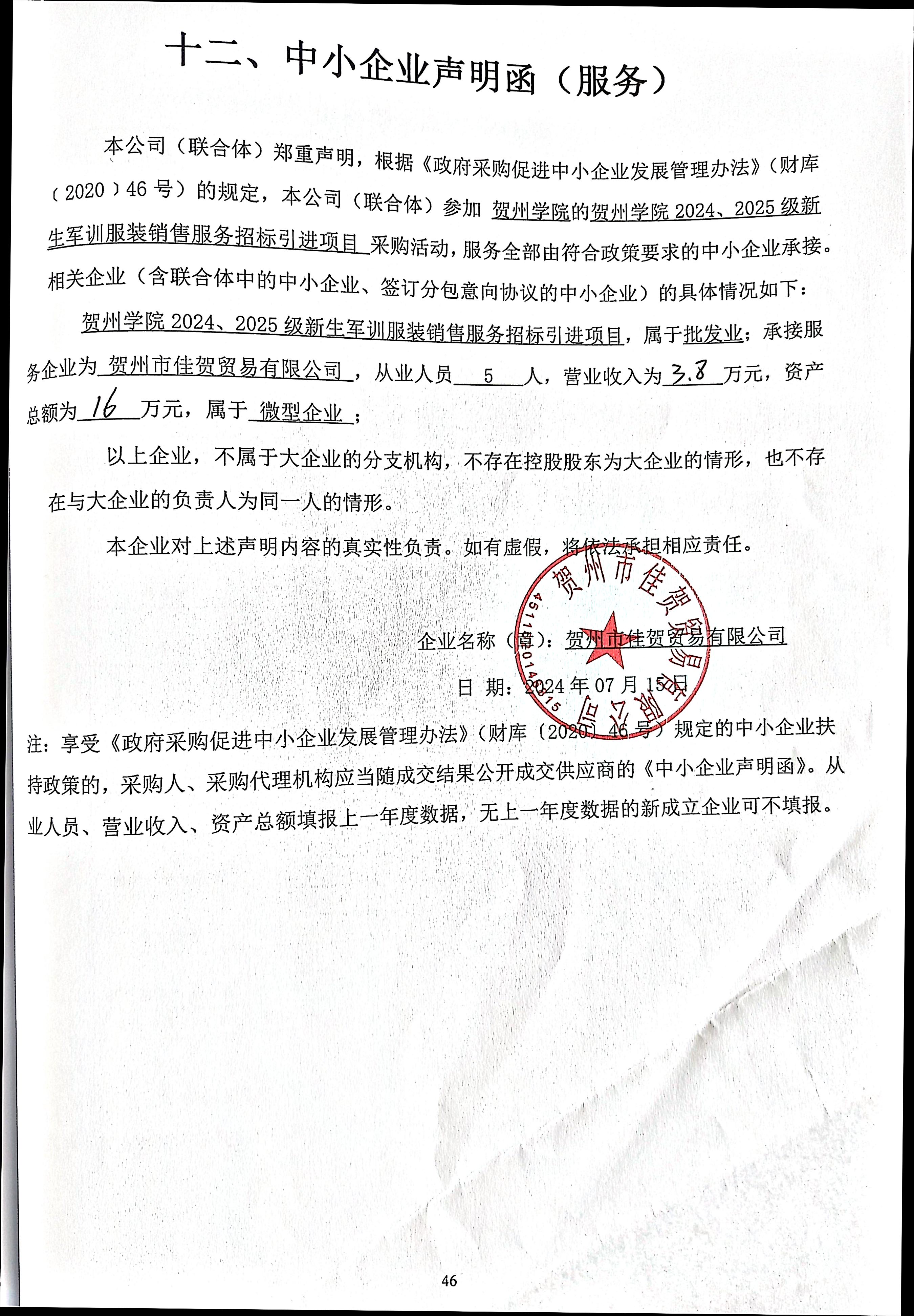 1、贺州市佳贺贸易有限公司《中小企业声明函》